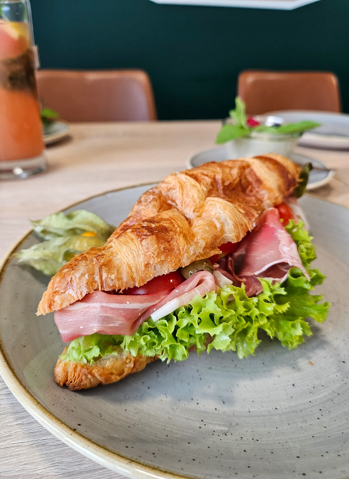 Croissant herzhaft belegt mit luftgetrocknetem Schinken, Oliven & Salat 6.50 EUR