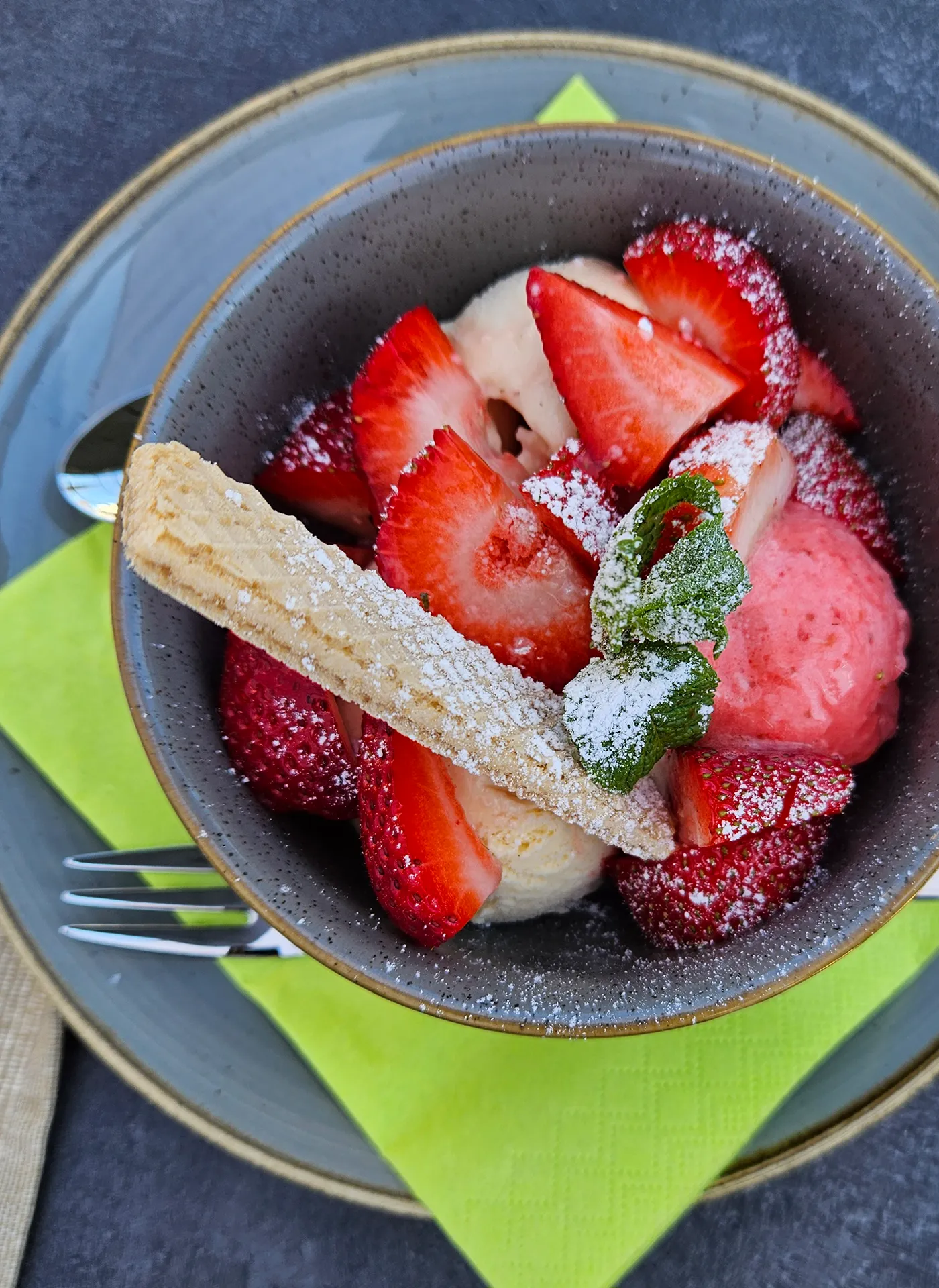 Vanille / Schoko / Erdbeere / Nuss-Duett / Joghurt-Zitrone 2.10 EUR (1 Kugel) / +0.50 EUR (mit Sahne)